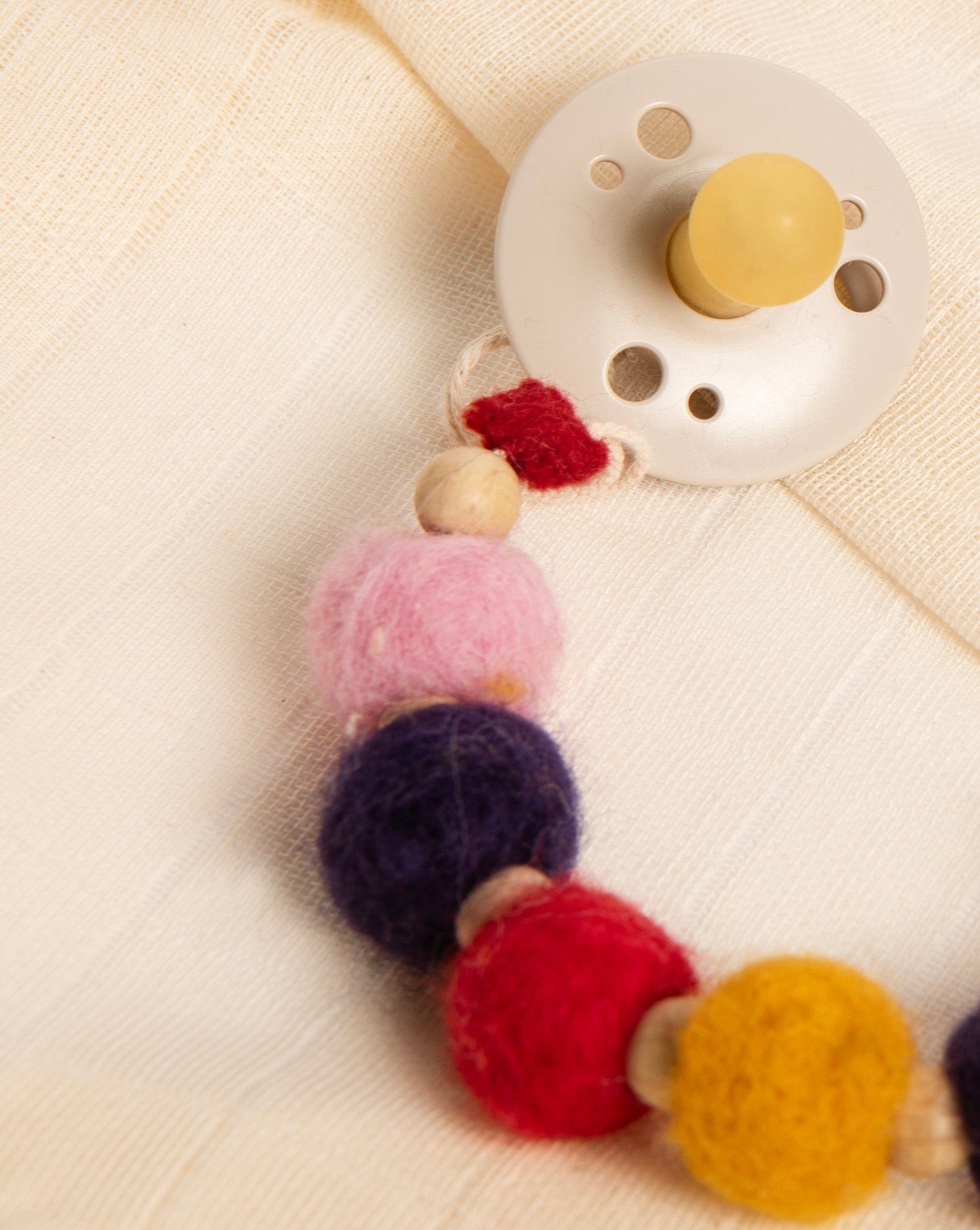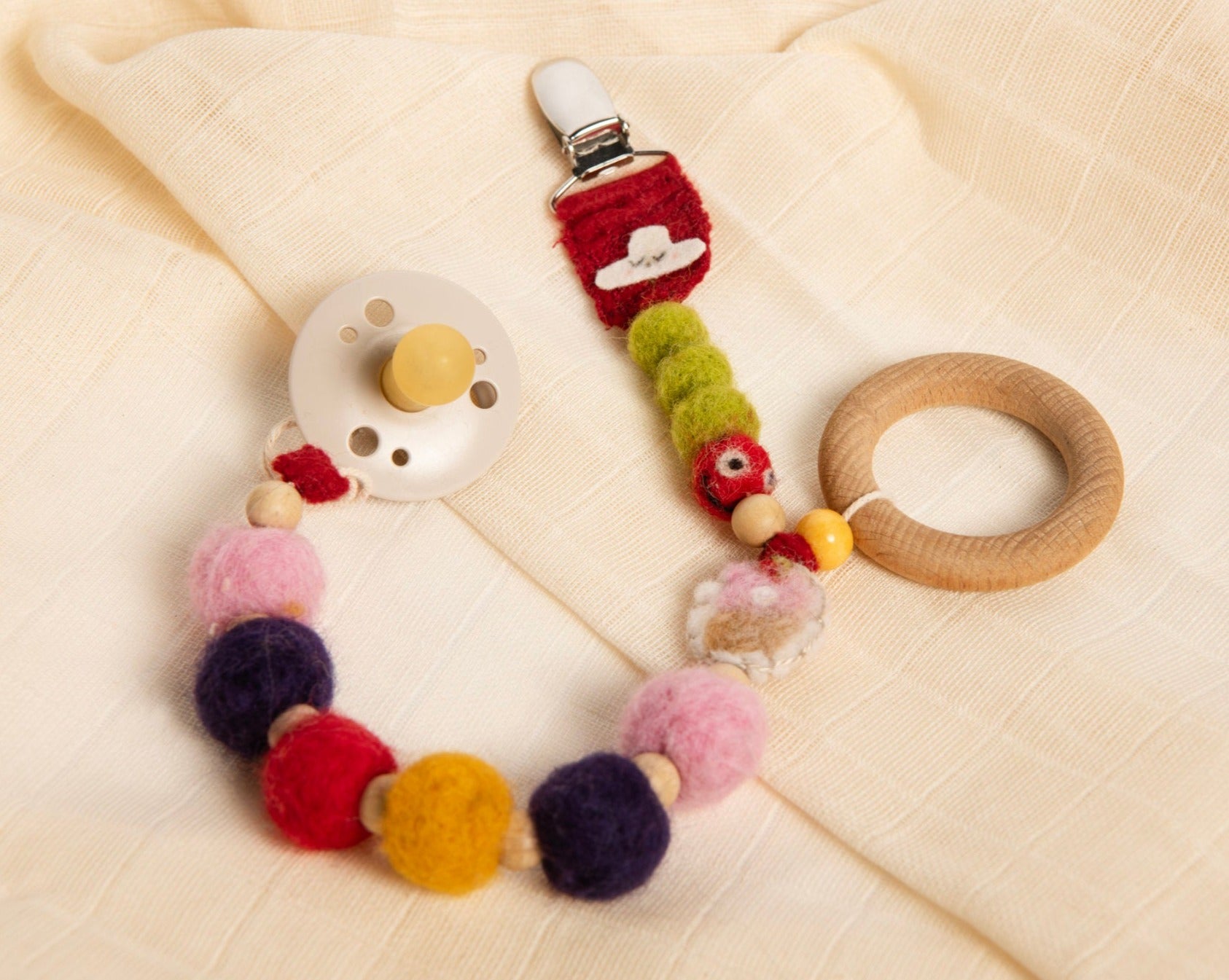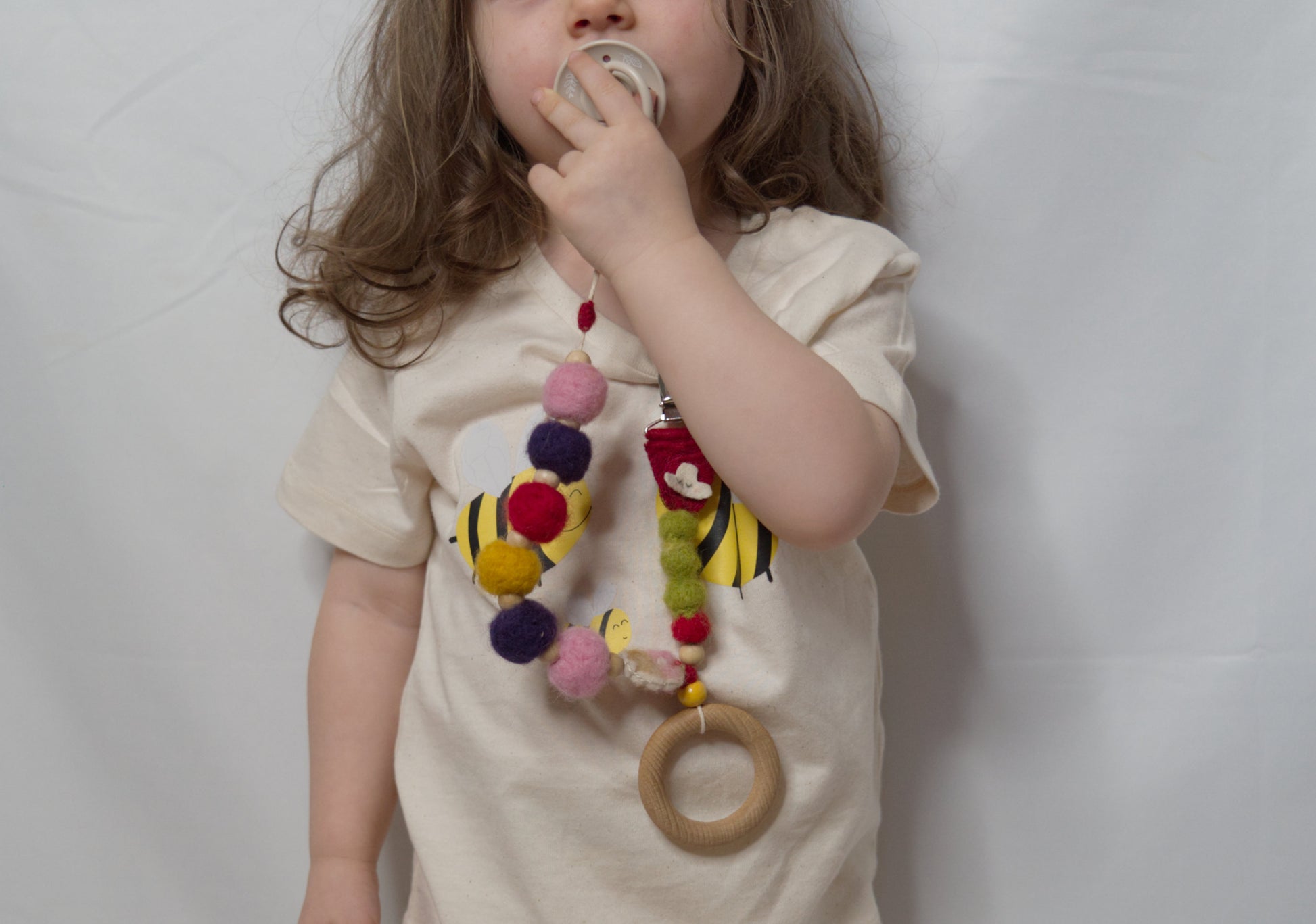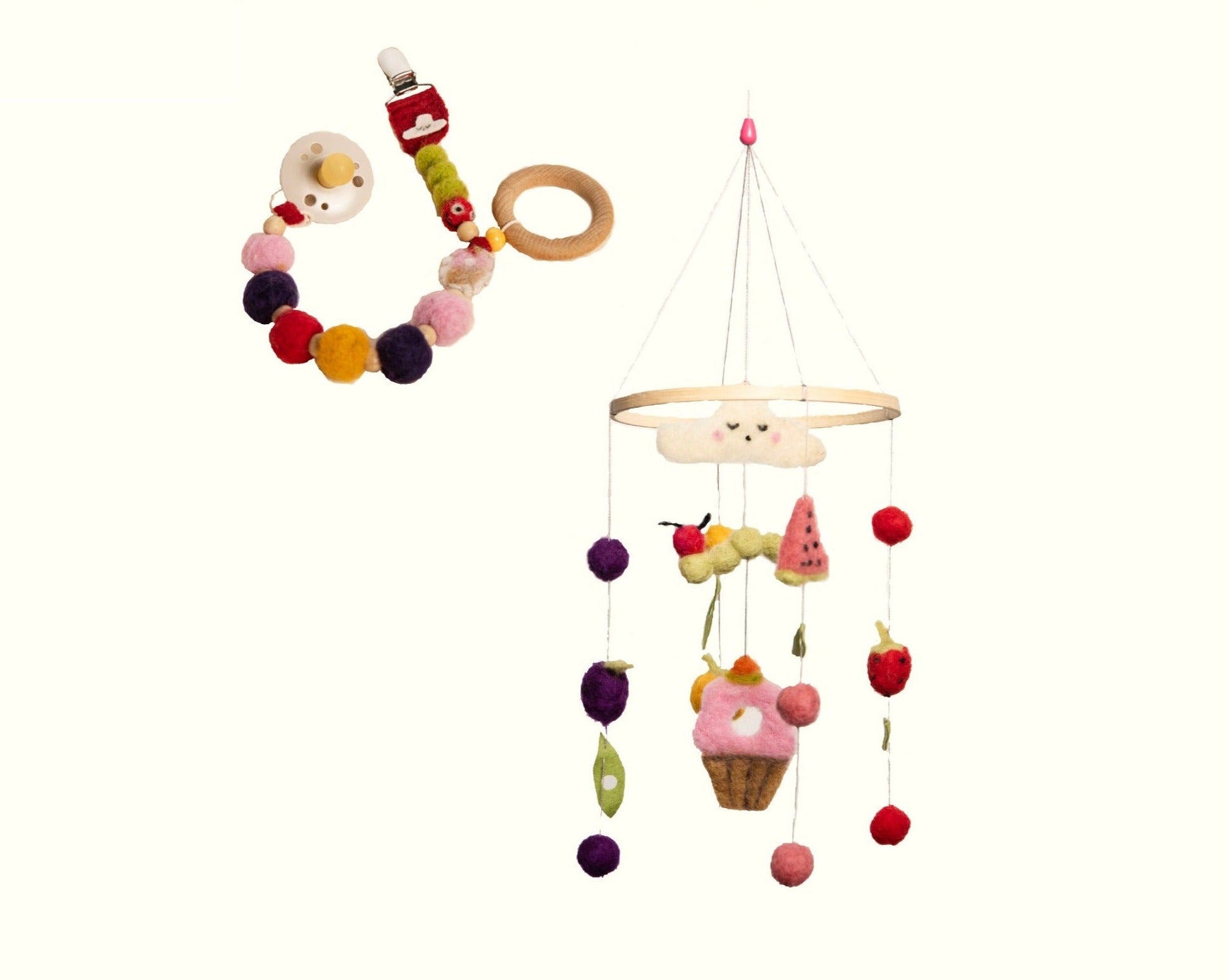 Hier bieten wir euch das Set, bestehend aus dem Mobile und der Schnullerkette zum Thema Foodie Raupe.