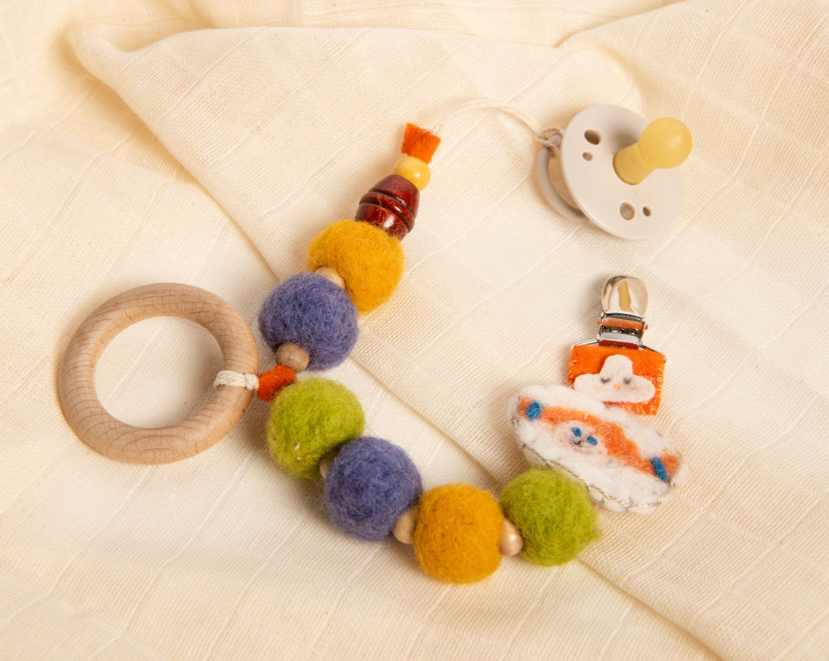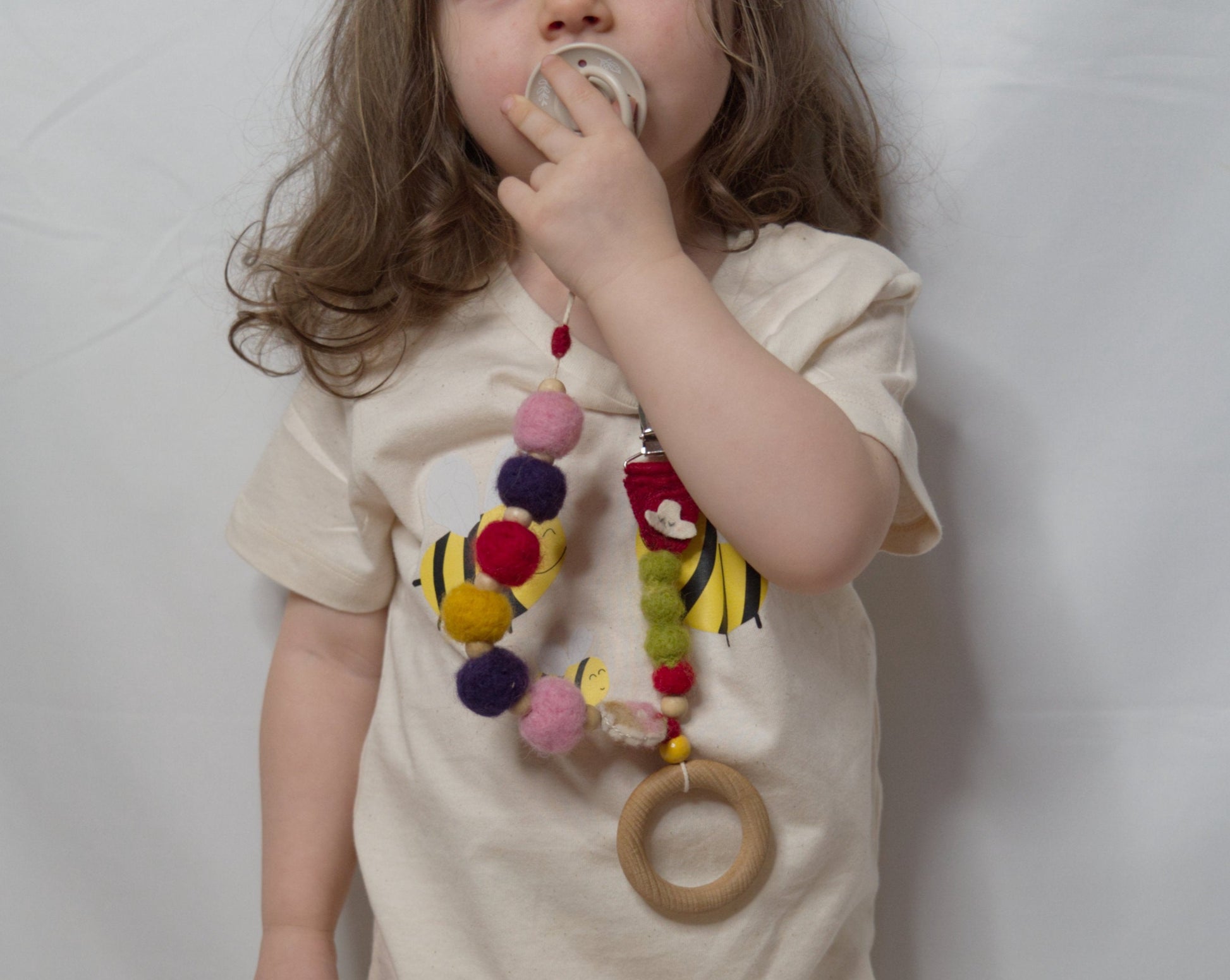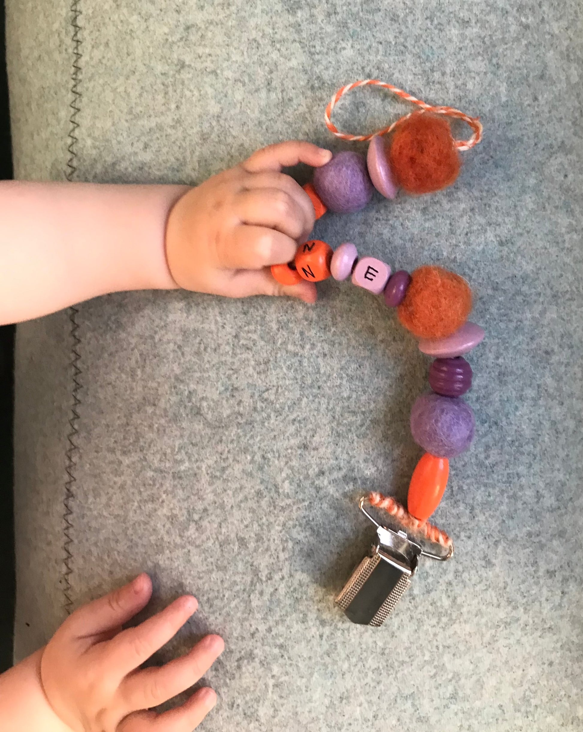 Die Spielzeugkette ist an einem kleinen Holzring mit einem Durchmesser von 6 cm angebracht und wird per Metallclip an der Kleidung oder ähnlichem befestigt. Der Schnuller selbst wird an einer dafür vorgesehenen Schnur befestigt (nicht in Lieferumfang enthalten).
